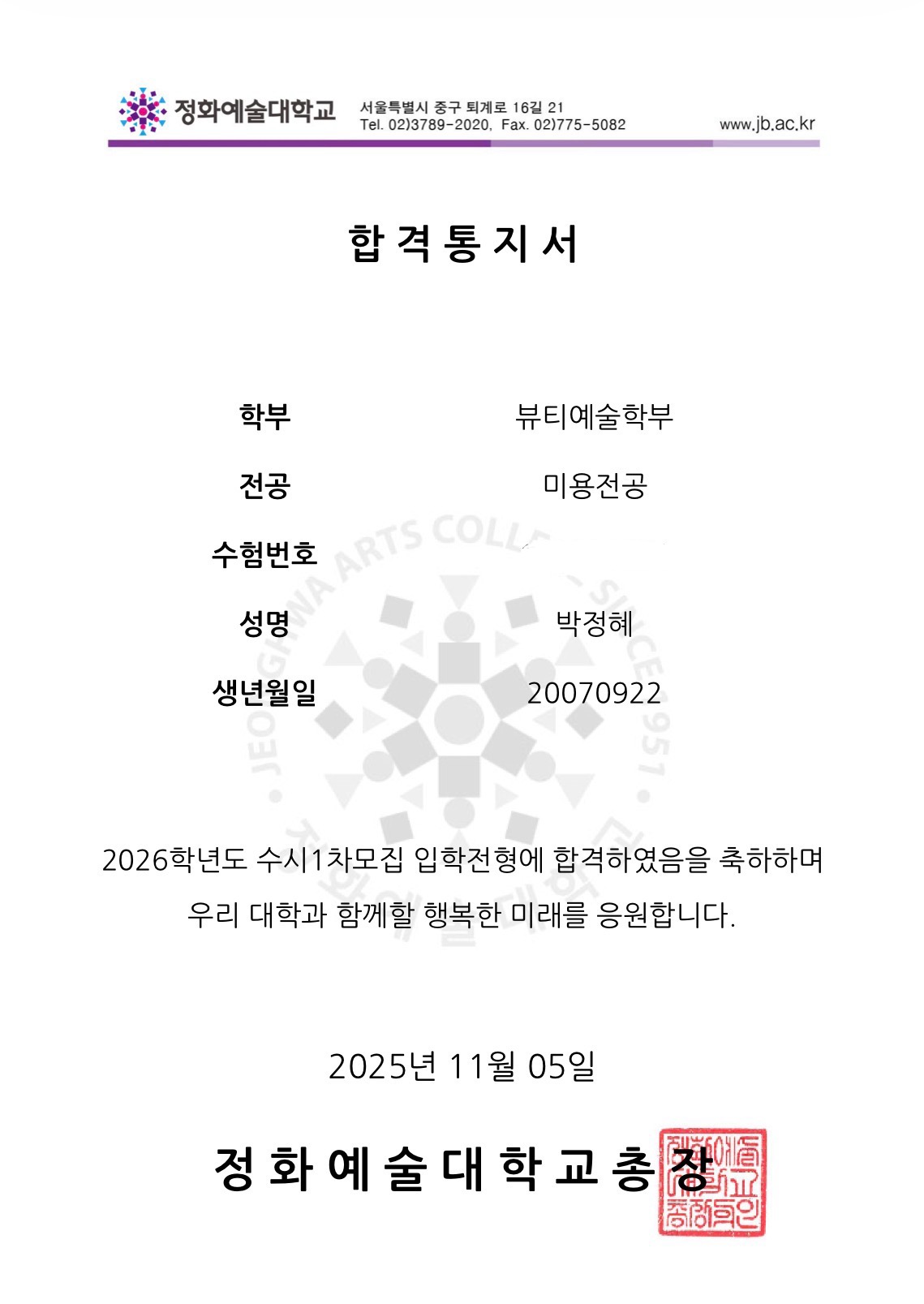 2025년 입시결과 - 이채은 서경대학교 헤어디자인과2026-03-13 18:41:52