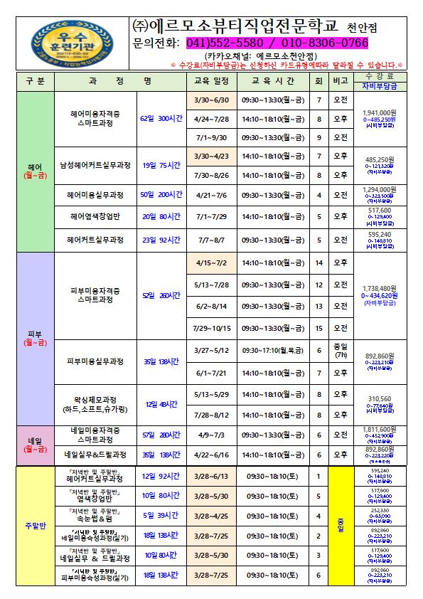 교육내용 게시판 직업기초능력 의사소통능력,문제해결능력,대인관계능력 미용이론 미용이론,피부학,소독학,공중보건학,공중위생관리법 기본헤어커트 헤어커트 준비하기,커트하기 기본헤어퍼머넌트웨이브 모발과 두피살펴보기,사전처리하기,약액 및 로드 선정하기,와인딩하기 기본헤어컬러링 피부테스트하기,색선정/배합하기,칼라도포하기,마무리작업하기 헤어세팅 헤어파팅하기,헤어쉐이핑하기,롤러컬링하기,헤어웨이빙하기 메이크업 피부표현,눈표현,입술표현,볼표현,수정 및 보완 메이크업